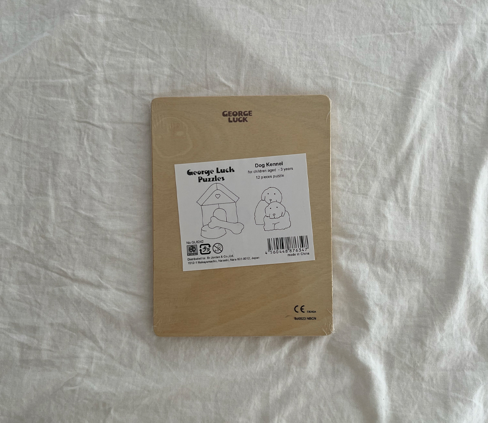 「George Luck(2重パズル・犬小屋)」は、イラストレーターのケイさんと、木工技術者のジョージさんご夫婦が自分たちのこどもを楽しませようと手作りで始めた木製パズルのブランド「George Luck Puzzle(ジョージ・ラック・パズル)」の製品。