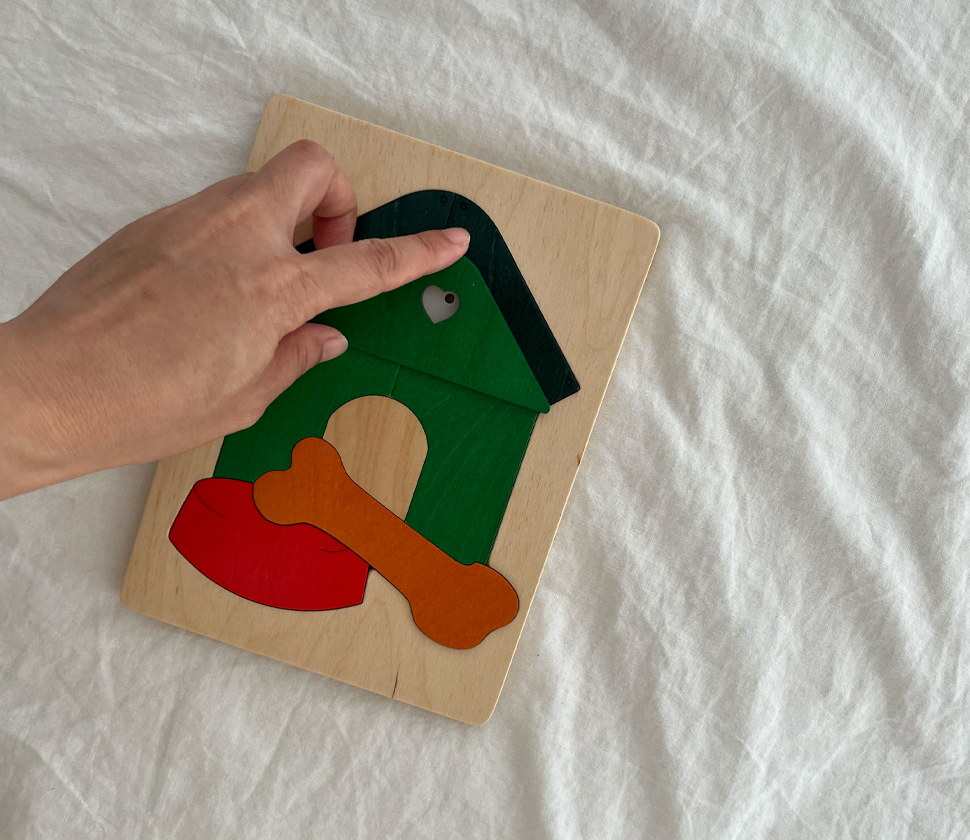 このパズルなら、ハートにくり抜かれているところにまずは指をはめてピースを外すと、白いお顔のお犬さんが見えます。